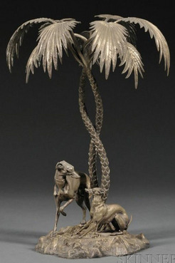A gilt bronze centerpiece with palm trees and whippets, England, 19th century, possibly Elkington & Co., Birmingham, with two entwined palms shelterin... [more detail available via subscription]