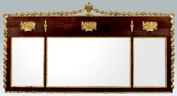 An early 20th century overmantel mirror, mahogany veneer, three panels with molded applied and gilt frames below pediment with urn and bellflowers, ot... [more detail available via subscription]