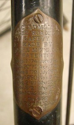 The Pope Manufacturing name badge on the Columbia Camel Back Light Roadster bicycle; image credit on full record. |