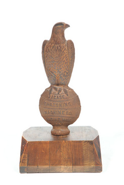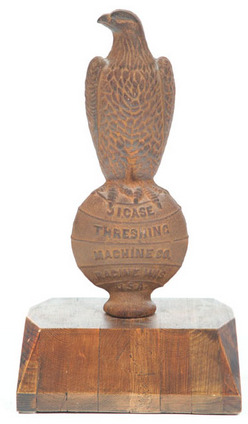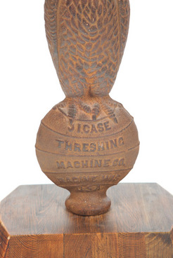 | | A JI Case Threshing Machine Co. cast iron eagle on globe advertising sign; image credit on full record. |