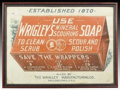 A Wrigley's Mineral Scouring Soap lithographed tin sign with product image in red wrapper.