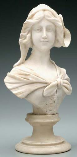 A Victorian alabaster bust. Young woman in bonnet on round socle, signed "A Cipriani", alabaster, Italian, 19th century.