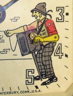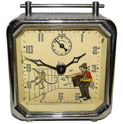 A circa 1848 Lux Clock Mfg Co., Waterbury, Conn, "Organ Grinder and Monkey", animated alarm clock having a black and chrome case, the main shaft of th... [more detail available via subscription]