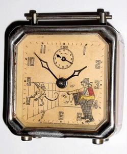 A circa 1935 Lux Clock Mfg Co., Waterbury, Connecticut animated alarm clock. "Monkey & Organ Grinder", clock still ticks and the organ grinders arm moves; image credit on full record.