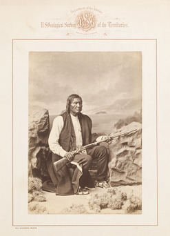 A Charles Bell half plate albumen photograph of "Friday, Arapaho Chief." Mounted on cream colored board with printed letterpress, "Department of the I... [more detail available via subscription]