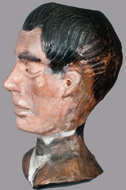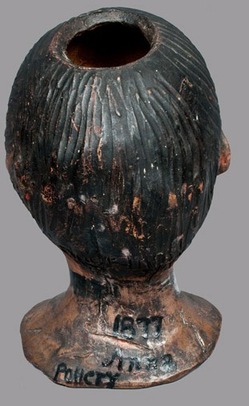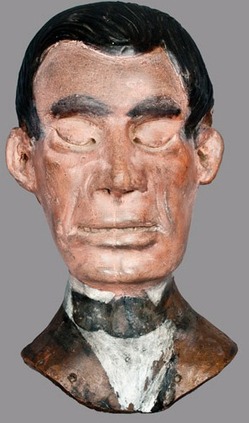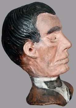 | | Salt-glazed stoneware Abraham Lincoln death mask with cold-painted surface, signed in paint on reverse "Anna Pottery / 1877," Wallace and Cornwall Kirkpatrick, Anna, Illinois, 1877, large-sized, wheel-thrown bust, hand-modeled in the form of Abraham Lincoln; image credit on full record. |