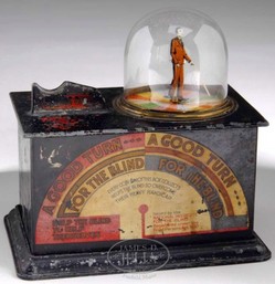 A coin-operated tabletop Fortune Teller. Interesting tabletop machine issued by the National Institute for the Blind featuring a blind man with a cane... [more detail available via subscription]
