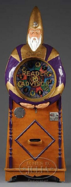Wizard Fortune Advisor arcade machine. Of more recent vintage, this gentleman advising one of their astrological future both by delivering a card and ... [more detail available via subscription]