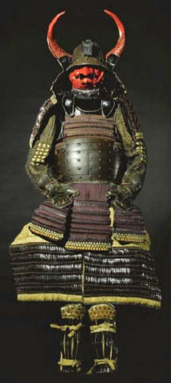 A suit of Japanese armor, Tosei Gusoku, 17th century. Complete set, comprising a thirty-two plate suji bachi helmet bowl with a large steep mabizashi ... [more detail available via subscription]