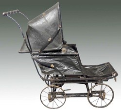 An early and unusual 1920s Gendron Black Baby Buggy. Collapsible frame carriage with footrest and canopy.