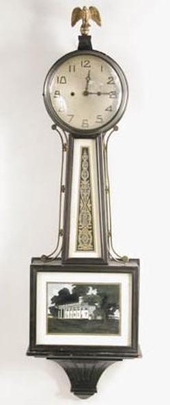 A New Haven Clock Company banjo clock. Two key wind holes at nine and three. Reverse painted panel with Mount Vernon, eagle finial, and two part pendu... [more detail available via subscription]
