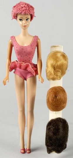 Miss Barbie doll with wigs. 1964 doll in original swimsuit with bathing cap, three wigs on wig stand, shoes, and booklet. This is the first Barbie to ... [more detail available via subscription]
