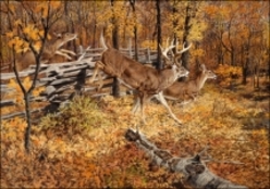 An oil on board painting by Tom Beecham (American, 1926 to 2000), Whitetails on the Move, signed lower left.