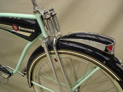 | Front fork and headlamp assembly on the Monark Firestone Super Cruiser bicycle; image credit on full record. |