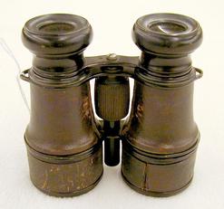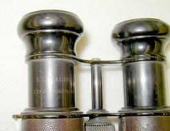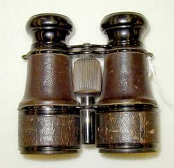 A late 19th to early 20th century German Binoculars, marked '5 1/2 Malige, Vergaosserlung' and 'Grosses and Gesichtsfeld', leather covered brass.