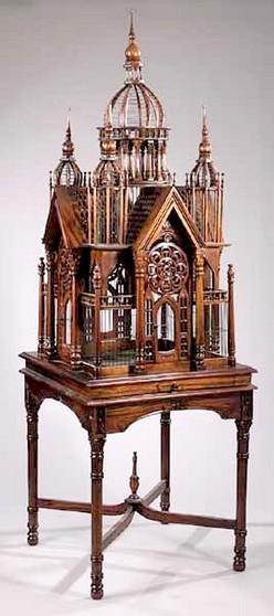| | A carved mahogany Cathedral birdcage on matching stand; image credit on full record. |