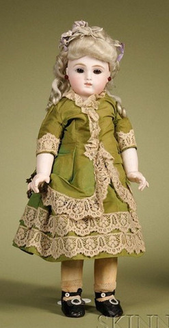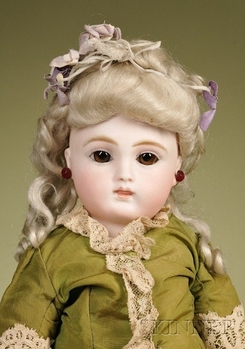| | An all-original French Joanny Bebe having brown paperweight eyes, finely painted brows and lashes, mauve shadow over eyes, a closed mouth with white space between lips, pierced ears, and her original fancy blonde mohair wig with cork pate; image credit on full record. |