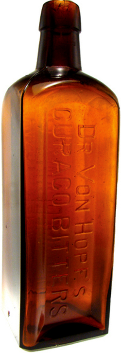 DR. VON HOPF'S CURACO BITTERS tooled top [amber glass bitters bottle with inset panels marked Chamberlain & Co, Des Moines, IA.] A square bottl... [more detail available via subscription]