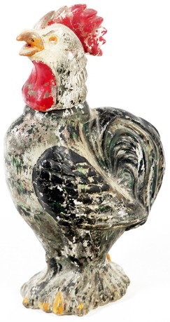 | | An Italian, early 20th century painted blown glass two part bottle in the form of a rooster, marked for Viarengo; image credit on full record. |