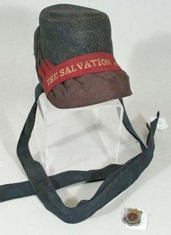 A Salvation Army bonnet, circa 1930, black straw with red silk ribbon "The Salvation Army" in gold. With separate metal shield-shaped pin.