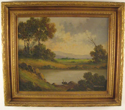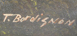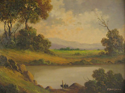 An oil on canvas painting by Toni Bordignon (Italian, born 1921). Landscape with lake, signed lower right T. Bordignon.