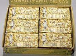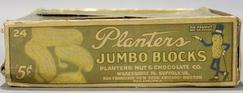 | A Planters Peanuts Candy Jumbo Peanut Blocks counter display box with marquee; image credit on full record. |