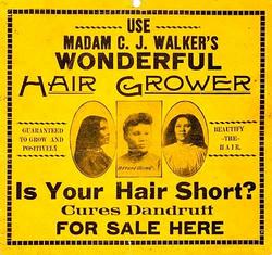 A placard for Madam's har grower - see the results. Use Madam C. J. Walker's Wonderful Hair Grower, advertising broadside with before-and-after photos... [more detail available via subscription]