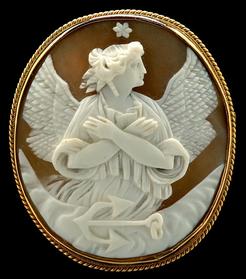 A Cameo shell brooch, carved angel with crossed arms, anchor beneath, gold-filled roped bezel mount.