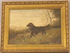 A framed 19th/20th century oil on artist's board dog painting, Sporting View of a Pointer [sic] [Setter] with Hare, signed "J. Brown" lower right.