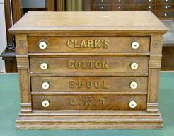 An oak four drawer Clark's spool chest or cabinet with original decals on ends, stenciled lettering on drawers and original porcelain pulls.