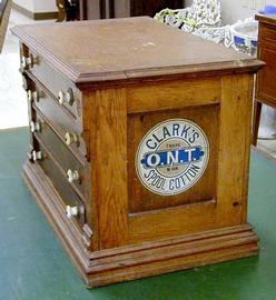 Cabinet; Spool, Clark's, 4-Drawers, Decals & Stenciling, Oak, 23 inch.