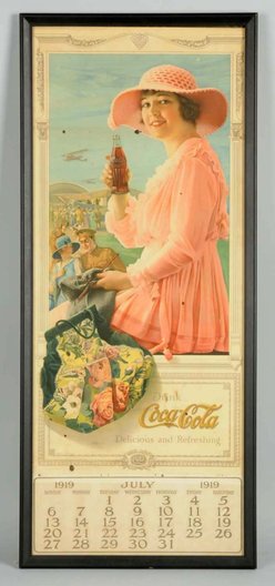 A framed 1919 Coca-Cola calendar with single page and metal strip at top. p4A.com note: WWI Aviators calendar, the girl with knitting... [more detail available via subscription]