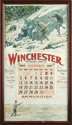 A framed Winchester 1899 Calendar. Original calendar, top & bottom bands intact. Top third is an A. B. Frost print of two early hunters, one carrying ... [more detail available via subscription]