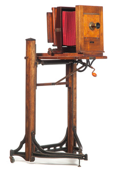 An "Eastman Kodak" camera and stand, Rochester, New York, early 20th century. Mixed wood frame with cast iron base. Bellows camera sits on adjustable ... [more detail available via subscription]