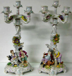 Pair of Dresden style porcelain candelabra, each figures with removable arms, applied floral decoration, Sitzendorf Porcelain Co., circa 1954.