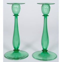 Steuben Candlesticks, American, 20th century. A pair of green glass Steuben candlesticks with swirl bases and candle cups. Both with etched mark to un... [more detail available via subscription]