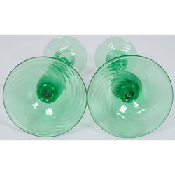 Steuben Candlesticks, American, 20th century. A pair of green glass Steuben candlesticks with swirl bases and candle cups; image credit on full record.