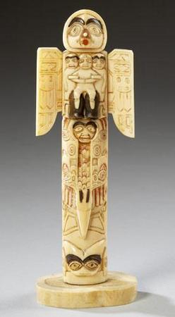 A Northwest Coast walrus ivory raven flood totem pole. Illustrates the legend that the raven at flood time flew up to heaven with the children in his ... [more detail available via subscription]