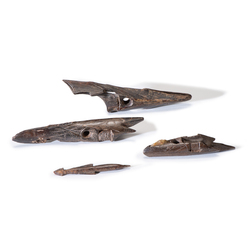 A lot of 4 Old Bering Sea Culture fossilized walrus ivory harpoon heads; image credit on full record.