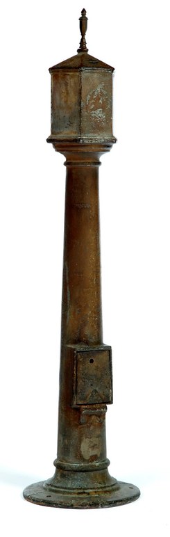 An alms box, late 19th or early 20th century, cast iron. Hexagonal receiver on a post with a lower keeper. Includes key.