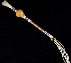 A Peyote Rattle with fine peyote stitch beadwork in shades of amber, dark and light blue against a white ground. Gourd rattle has a beaded top with bl... [more detail available via subscription]