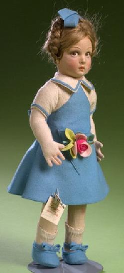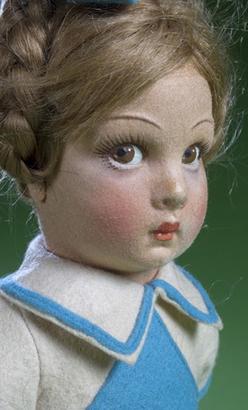A signed Lenci doll with brown eyes and a blonde wig dressed in a blue and white felt dress with bows and flowers; image credit on full record.