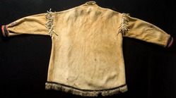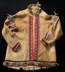 An Athabascan beaded hide jacket, thread-sewn using glass bead colors of white, pink, pea green, and medium blue to decorate red and black cotton trim... [more detail available via subscription]