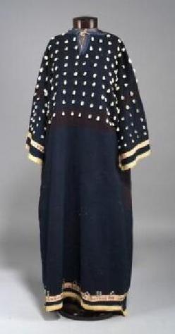 A late 19th century Central Plains Lakota woman's trade cloth dress, the blue trade cloth dress with ribbonwork above the selvage edging on the sleeve... [more detail available via subscription]