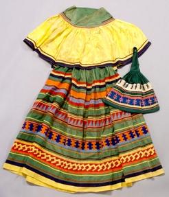 A Southeast Woman's dress and handbag, Seminole, circa 1920s. Brightly colored traditional cloth outfit of a skirt and cape, applique and Seminole pat... [more detail available via subscription]