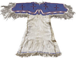 | A Sioux dress of tanned hide having a fully-beaded yoke with four large crosses and geometric motifs along the border; image credit on full record. |