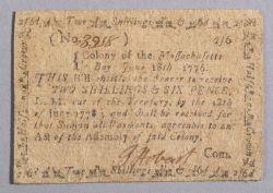 | | A two shilling, six pence 1776 Massachusetts colonial note; image credit on full record. |