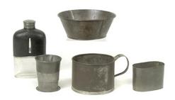A lot of four Civil War tin and pewter camp ware items; image courtesy Cowan's Historic Americana Auctions.;