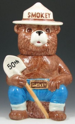 A Smokey the Bear 50th Anniversary cookie jar, Treasure Craft [pottery] designed by Don Winton. Marked Treasure Craft and numbered 112/250.