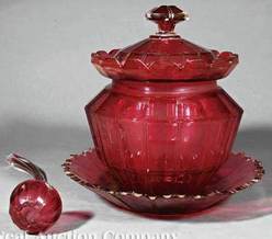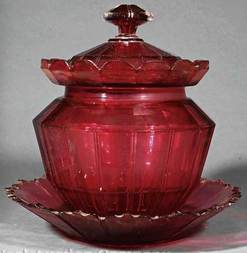 Cranberry Glass; Punch Bowl & Cover, Ladle & Undertray, Faceted, Scalloped Rim, 13 inch.